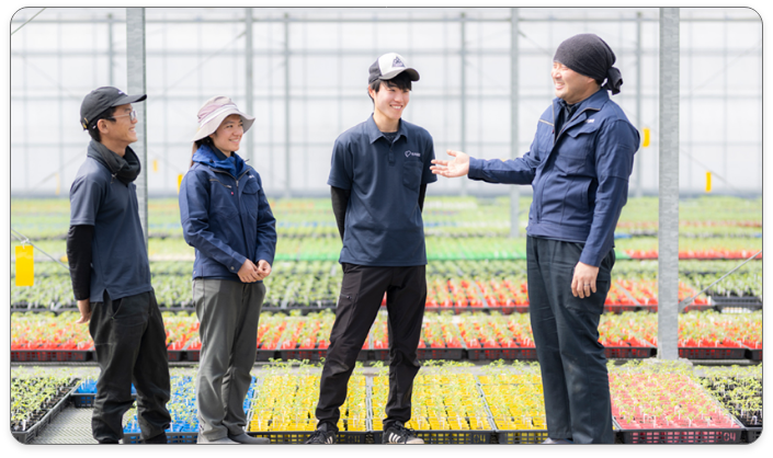 瞬く間に変化する現代社会において、私たちは進化し続ける必要があります。創業の精神である「安心して植えていただける苗作りに挑戦」を胸に、先代より引き継いだ育苗事業を進化させ、そして新しい価値を加えていくことで農業の発展に貢献していく所存です。技術の進歩や市場の変動に柔軟に対応して、常に良質の苗を提供できるようあらゆることに挑戦しながら、お客様や社会への責任を果たしていきます。そのためにも従業員一人ひとりがスペシャリストとして自覚や責任を持ち、個々の力を最大限に引き出し、アグレッシブに行動できる環境づくりに努めたいと思います。チーム全体が協力して目標に向かって進むことが我々の成功のカギであり、お互いを尊重し信頼し合うことで、更なる高みへと進めると信じています。